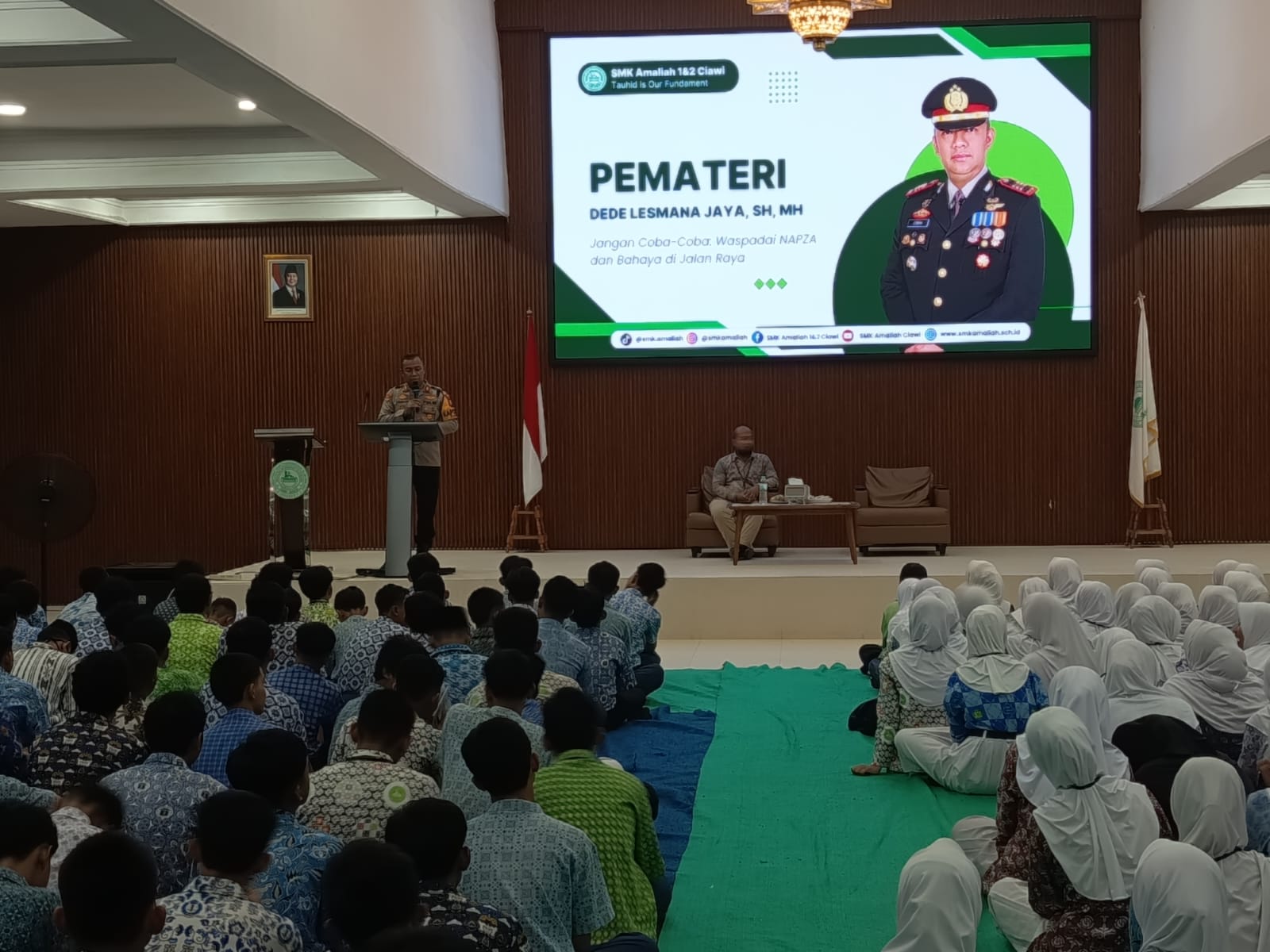 Turut hadir dalam kegiatan ini, Kepala SMK Amaliah 1, Tisna Sudrajat, S.I.Kom., GR., ACA, serta Kepala SMK Amaliah 2, Dr. Gugun Gunadi, S.Pd., M.Pd., beserta jajaran guru dan staf sekolah, Materi yang disampaikan oleh Kapolsek Ciawi mencakup pencegahan narkoba, tertib berlalu lintas, upaya menghindari perundungan (bullying), serta bijak dalam menggunakan media sosial.
