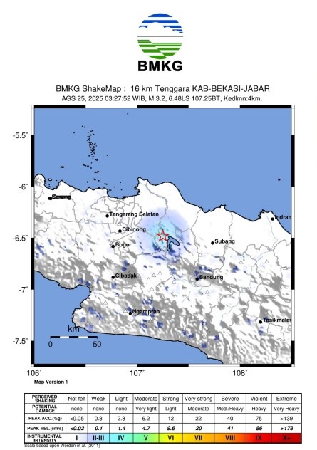 Wapenja.com/Bekasi – Wilayah Kabupaten Bekasi, Jawa Barat dan sekitarnya Kembali diguncang gempabumi tektonik. Hasil analisa BMKG menunjukkan bahwa gempabumi ini berkekuatan M=3,2. Episenter terletak pada koordinat 6.48 LS dan 107.25 BT, atau tepatnya berlokasi di darat pada jarak 15 km Tenggara Kabupaten Bekasi, Jawa Barat pada kedalaman 4 km pada Hari Senin, 25 Agustus 2025 pukul 03:27:52 WIB.