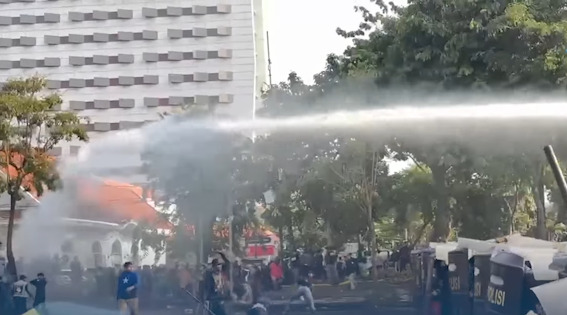 Polisi yang berjaga di lokasi berupaya memadamkan api dengan menyemprotkan air dari kendaraan meriam air (water cannon).