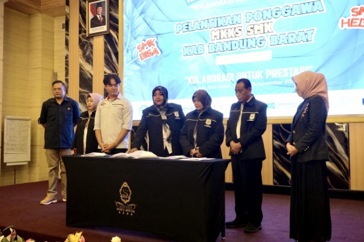 Wapenja.com/Bandung Barat — Musyawarah Kerja Kepala Sekolah (MKKS) SMK Kabupaten Bandung Barat resmi melantik kepengurusan periode 2025–2028 pada Selasa, 25 November 2025 kemarin, bertempat di Sutan Raja Hotel. Acara berlangsung khidmat dan dihadiri langsung oleh Kepala Cabang Dinas Pendidikan Wilayah VI Jawa Barat, Dr. Hj. Nonong Winarni, S.Pd., M.Pd., para kepala sekolah, pengawas, dan tamu undangan.