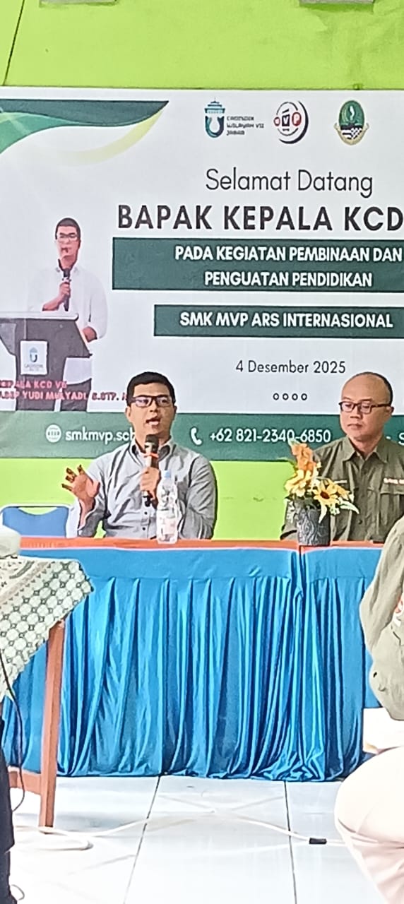Wapenja.Com/Bandung — Kepala Cabang Dinas Pendidikan Wilayah VII Jawa Barat, Asep Yudi Mulyadi, S.STP., M.A.P., melakukan kunjungan kerja pembinaan ke SMKS MVP ARS Internasional Bandung, berlokasi di Jalan Sekolah Internasional No. 1–6, Cicaheum, Kecamatan Kiaracondong, Kota Bandung. Seluruh rangkaian kegiatan berlangsung di Aula SMKS MVP ARS Internasional Bandung,pada hari kamis 04/12,dihadiri oleh seluruh guru, tenaga kependidikan, serta jajaran pimpinan sekolah.