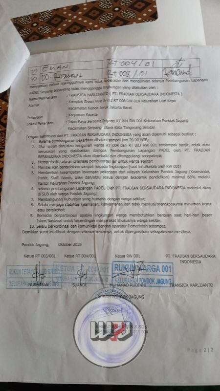 Wapenja.com/Serpong Utara, Kota Tangerang Selatan – Pembangunan lapangan padel yang berlokasi di Jalan Serpong KM 8, RT 004 RW 001, Kelurahan Pondok Jagung, Kecamatan Serpong Utara, Kota Tangerang Selatan, telah melalui proses yang transparan dan dipastikan sesuai dengan peraturan perizinan, termasuk telah memperoleh Izin Bangunan Gedung (Izin BG) serta persetujuan penuh dari warga dan elemen lingkungan setempat.