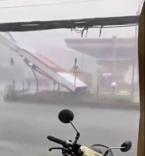 Plang SPBU di daerah Cibolerang roboh akibat hujan deras disertai angin kencang.
