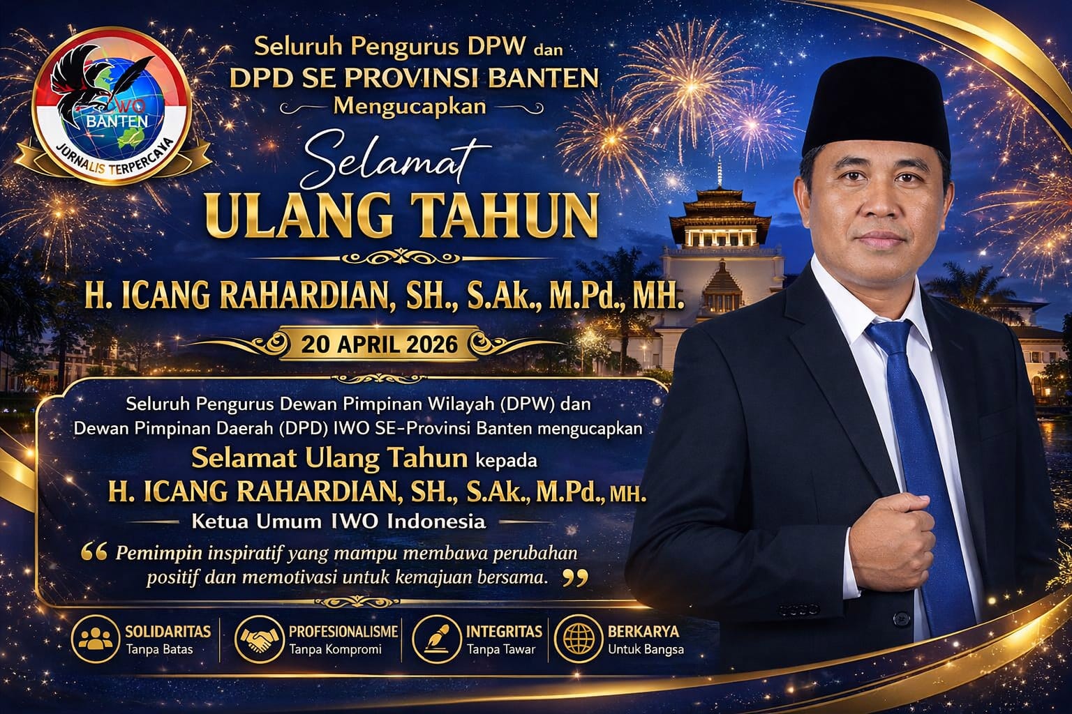 Banten, 20 April 2026 — Seluruh jajaran Dewan Pimpinan Wilayah (DPW) dan Dewan Pimpinan Daerah (DPD) Ikatan Wartawan Online Indonesia (IWO-I) se-Provinsi Banten secara serentak menyampaikan ucapan selamat ulang tahun kepada Ketua Umum IWO Indonesia, H. Icang Rahardian, SH., S.Ak., M.Pd., MH.