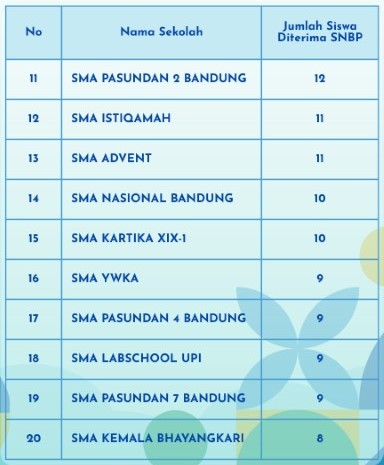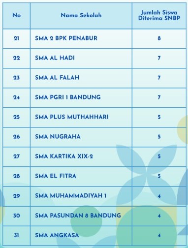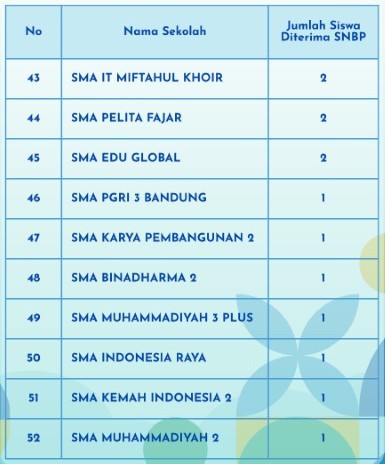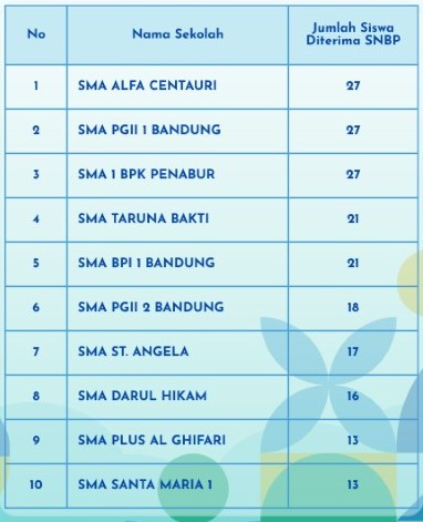 Data kelulusan SNBP 2026 ini disusun berdasarkan jumlah siswa yang dinyatakan lolos seleksi hingga pembaruan terakhir pada hari Sabtu, 04 April 2026 pukul 06.57 WIB. Dengan hasil ini, Bandung kembali menegaskan posisinya sebagai salah satu kota dengan ekosistem pendidikan yang dinamis dan produktif.